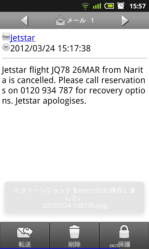 今日の午後、一通のSMSが着信しました。英語が出来なくても、ほぼ内容は察知できました(悲)。