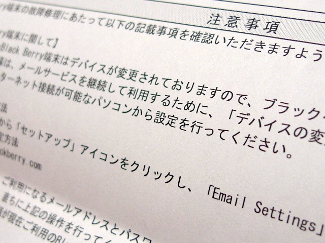 そして、修理についての注意事項を読んでみると、「BlackBerry端末は、デバイスが変更されて」との一文が。あれ? もしかして、iPhoneみたいに交換修理なのかな??
