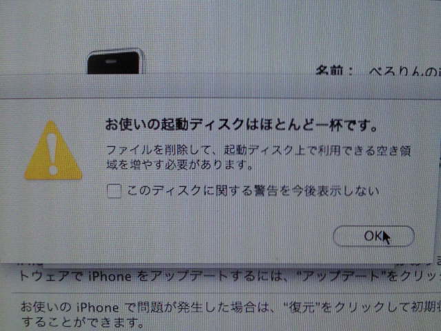 ファームを何度も入れ直していたら、iMac G5にこんな警告が出るようになってしまいました。なんと、内蔵HDDは60MB程しか残っていないようです(驚)。