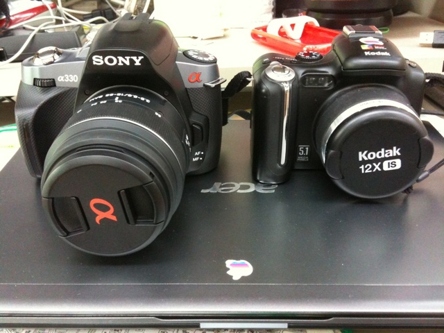 今までメインに使っていた、コダック『P850』とソニー『α330』を並べてみます。背景汚くてごめんなさい(苦笑)。