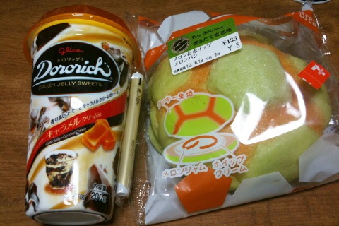 というわけで本日は、やはり新作(かな?)の『ドロリッチ カフェゼリー キャラメル クリームin』と、『メロン&ホイップ メロンパン』。