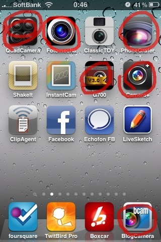 そんな中、iPhoneでは一番使用頻度の高いカメラアプリ、『ブログカメラ』(写真右下)のシャッター音が、出ない設定のはずなのに出るようになってしまいました(苦笑)。
