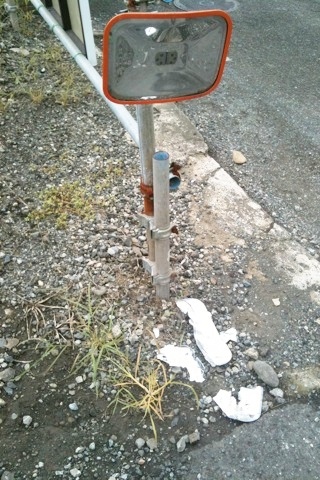 今利用している駐車場は、古い小クリートの塀に仕切られているので、出る時は全く見えず、死角だらけ。頼りになるのは、このミラーだけだったのですが、先日誰かに割られてしまいました(困)。