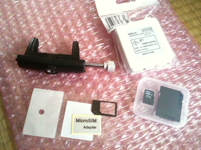 小さい方は、『携帯電話用三脚固定ホルダー』、『USB-ACアダプタ USB2ポートタイプ』、『MicroSIM→SIMカード変換アダプタ』(謎:笑)。