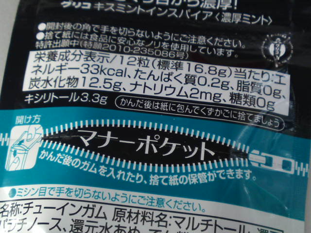 袋状のパッケージが面白く、裏には「マナーポケット」というのが付いています。ココを開くと、正にポケット。食べ終わったガムを入れられるという発想は素晴らしいですが、リサイクルには問題(空き缶にタバコ入れると不可)ないのかな?