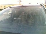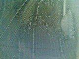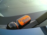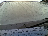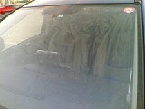 撥水剤をフロントガラスに塗り込みます。画像右のように、白く乾いたら完了、、、簡単(喜)!