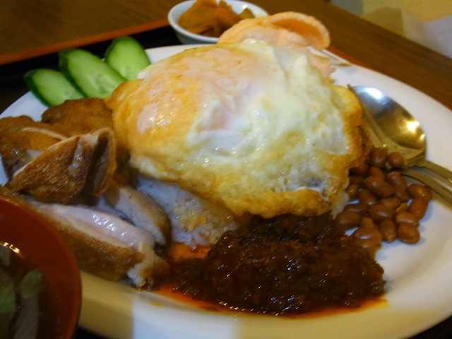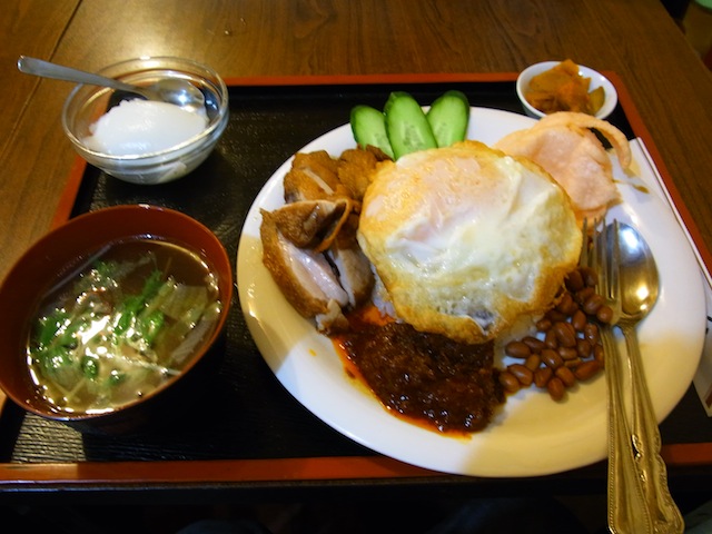 ターンオーバーの目玉焼きがご飯の上に載っていて、揚げた鶏肉とピーナッツと中華な煎餅(?ピンクの)と、小魚と味噌か何かを和えた佃煮のようなもの。