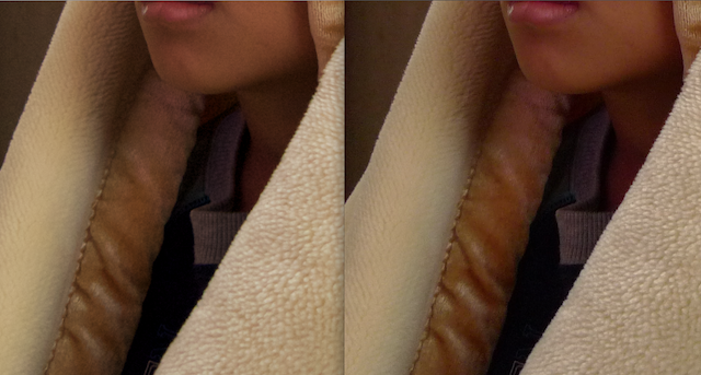 実際には、左がRAWで右がJPEGなのですが、小さいままの時はパッと見JPEGの方が綺麗に見えました。保存(圧縮)時に少し補正してるのでしょうか。でも、拡大してみると、やはりJPEGは圧縮されたノイズの様な模様が出ています。