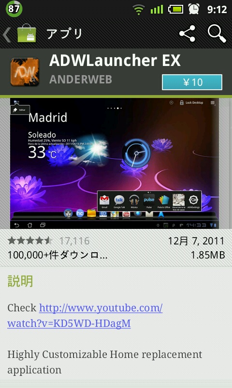 今日は、ホーム画面(って言うんだっけ?)の動作のもっさりな端末に入れてやると、サクサクと動いてくれるようにしてくれる『ADWLauncher EX』が10円でした(嬉)!