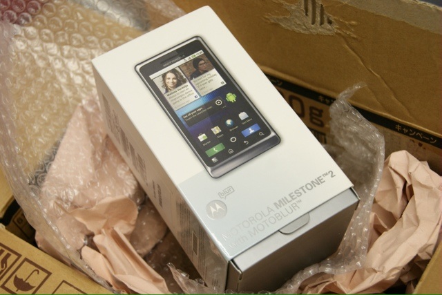 いやーっ!きちゃった、届いちゃった。Motorolaってみんなこの箱なのかな。PHOTONと色違いの同じ箱ですね。