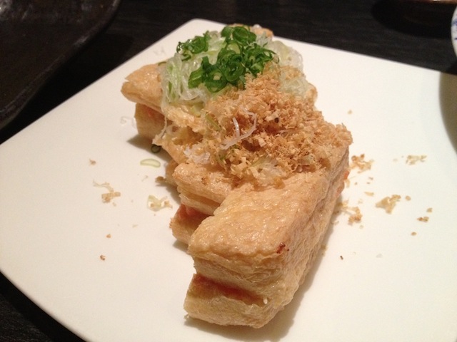 厚揚げ(あれ、油揚げ?)の間に明太子を入れて焼いてあります。期待通りのお味で◯。