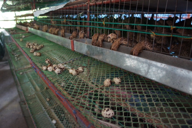 鶉(うずら)の卵。たくさん産ませる為に音楽を流すのだとか。