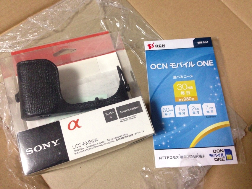 ソニーのミラーレスカメラ『NEX-3』用の『ボディケース ブラック LCS-EMB2A/B』と、NTTコミュニケーションズ 『OCN モバイル ONE SIMパッケージ』。