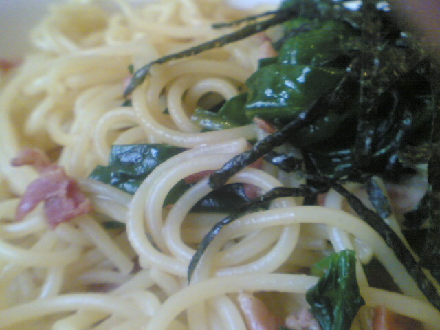 大盛りにしたためか、ちょっと盛りつけの見栄えが良くないですが、歯ごたえのある生パスタはおいしいです。
