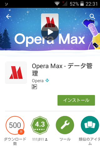 「ひと月500MB未満」が無料の従量制とのことなので、以前から使ってみたかった『Opera Max』をインストール!