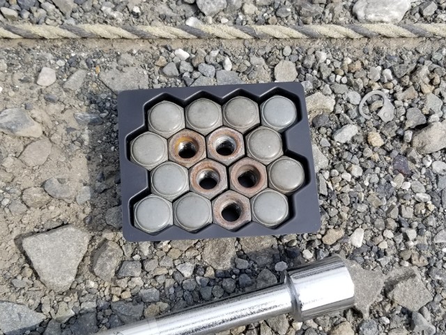 軽自動車の4本分のナット16個。うち5個が貫通ナットに変化していました。