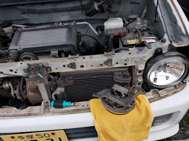 そしてフォグランプのステーを止めている10mm(だったかな)のボルトを3本外して、裏側の+ネジも2本。ようやくバルブにたどり着きます。
