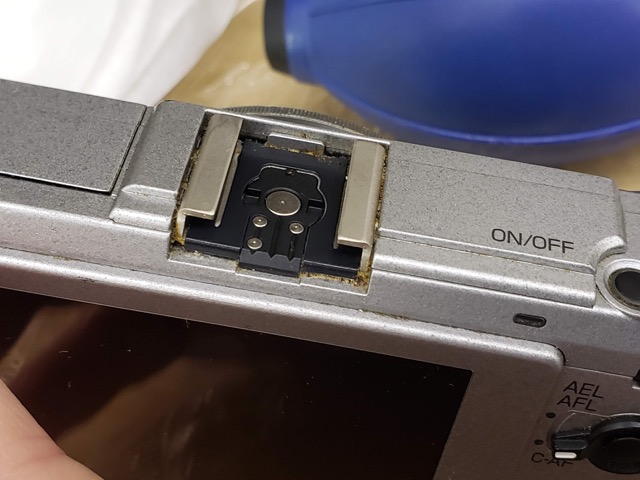 アクセサリーシューにもレンズの銅鏡部にも、隙間があれば入り込むように付着しています。