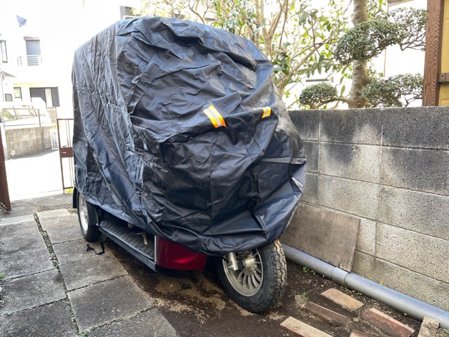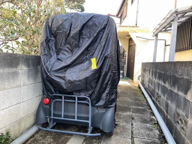本当は「カート用カバー」といった、ゴルフカートのような四角い車体形状対応だと、すっぽりと被せられるのだと思う。