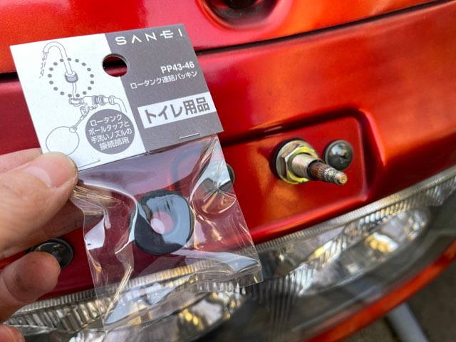 ネット上ではさまざまな対応策が取られています。手っ取り早く、交換するならコレ。トイレ用品の「ロータンク連結パッキン PP43-46」。