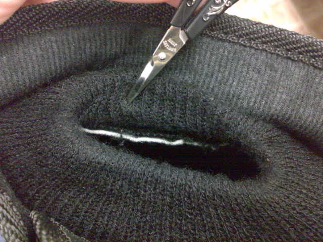 小さな鋏の先を生地の目から差し込んで、中のゴムだけを切ります。