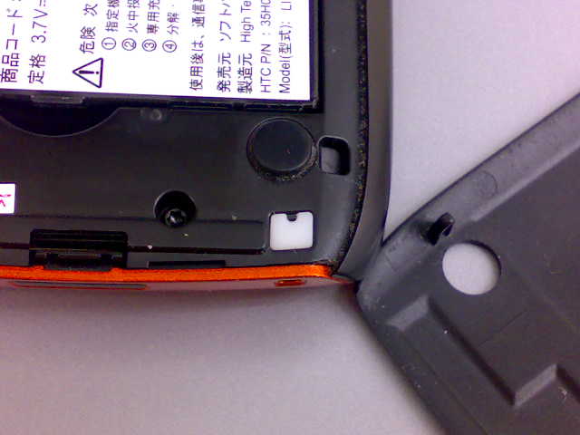 バッテリカバーを外すと、右下に白くいかにも“外せます”といったプラスチック(ゴム?)が入っています。