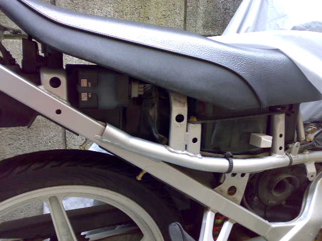 問題のブッシュは、写真中央の部分に入ります。一番大きなリアサイドカウルを固定する箇所です。