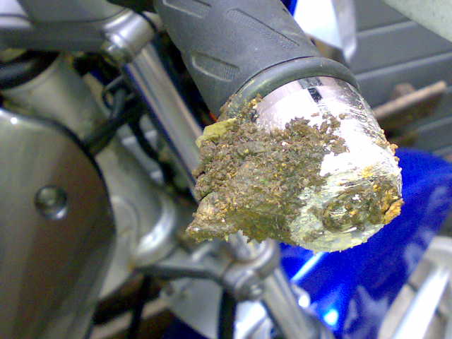 グリップエンドの汚い泥は、、、自宅に着いてスタンドを立てる際に、思わずバランスを崩してしまってこらえ切れず、、、倒しちゃいました(苦笑)。