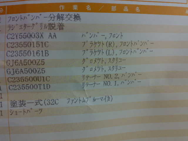 塗装済みのバンパーが品切れ(?)だったとかで、無塗装のバンパーに塗装代もかかっているので、かなりイイお値段(9万超)の見積もり、、、もし自腹だったなら、もっと適当な方法で済ませちゃいますよね(笑)。