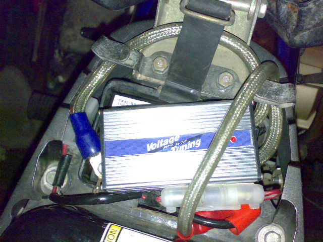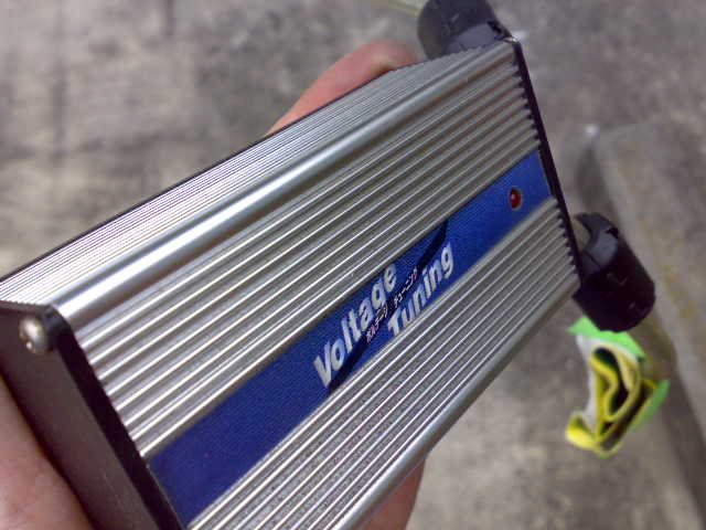 プレマシーのバッテリーボックス内に貼り付けてあったコンデンサ、『ボルテージチューニング』って、全然メジャーでもなんでもない商品ですね(笑)。