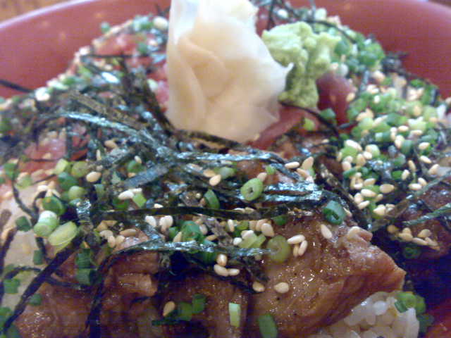 大盛りご飯(選択:笑)の上に乗るのは、「ほほ身炙り・中落ち・ねぎトロ」のマグロ三昧(笑)。