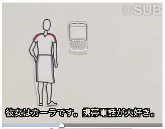 いや、なんて事はありません。公式ページにある「ビデオを観る!」というのを観てみたら、「彼女はカーラです。携帯電話が大好き。」というシーン、、、