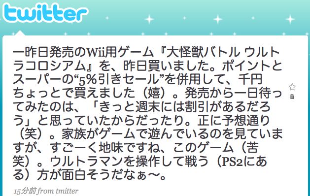さっきメールからの投稿先を間違えて、日記の内容をTwitterにアップしてしまったのですが、途切れた文章の末にある「...」のリンクをクリックしてみると、ちゃんと全文表示されちゃいました。不思議?