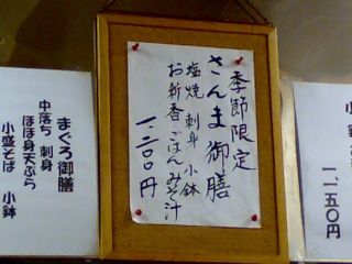えーと、ちょっとハミ出している通り(笑)、大きくてしつこくない程度の脂ののった、美味しいさんまでした。目の前のガラスケースから連れていかれるさんま二尾の姿が、ちょっと愛おしく思えました(笑)。