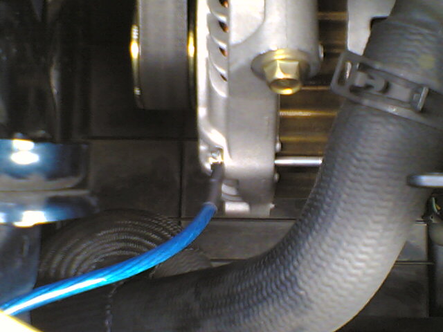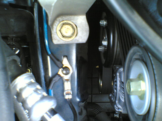 エンジンルームに向かって左上から、既存のアースポイントに共留め。そこから分岐させて、すぐ手前のフレームにある既存アースポイントを経由します。さらにそのポイントと、オルタネーターとを繋いで左側は終わりです。