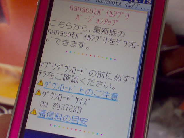 昼食にカップラーメン(笑)でも買いに行こうかと、おサイフケータイ(W61Sね)のアプリ、『nanacoモバイル』を起動させた所、「バージョンアップが必要です」なんて警告が出てきました。