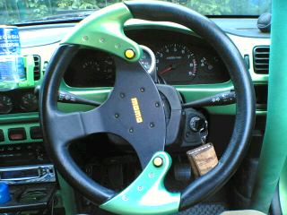前方を見ると、やはりハンドルまでも、、、というか、パネル類、ましてはロールバーまでも“緑色”で統一されています(驚)。そして、あまりの驚きに写真を撮り忘れましたが、ホイール、エンジンルームも、、、「脱帽です」。