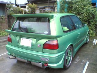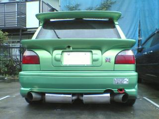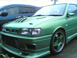 ちょうどプレマシーで出ていて、駐車場に戻って来た所へ、ちょっと派手めの音を響かせながら隣に駐まった“緑色”の車。いやぁ〜、見た目も派手です(笑)。