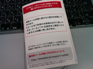 イー・モバイルから「迷惑メール対策(OP25B)について」という葉書が届いたので、早速設定をしてみました。