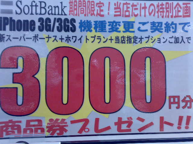 それは、在庫がSBショップとスーパーでしか確認が取れなかったのですが、写真の通り、このお店だと機種変更時に3000円の商品券がいただけるからなんです(笑)。