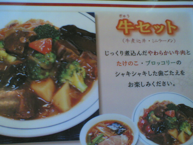 ついでに、彼女が食べた『牛セット』。「牛煮込み丼・ミニラーメン」というランチメニュー(?)です。