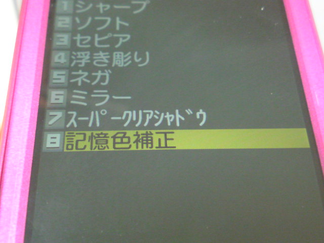 白けたカメラ画像ですっかり使う気を削がれたP-02Aですが、なにか設定項目は無いのかと色々とメニュー内を探していたら、「ピクチャ編集 → フォトレタッチ → 記憶色補正」という項目を見つけました。