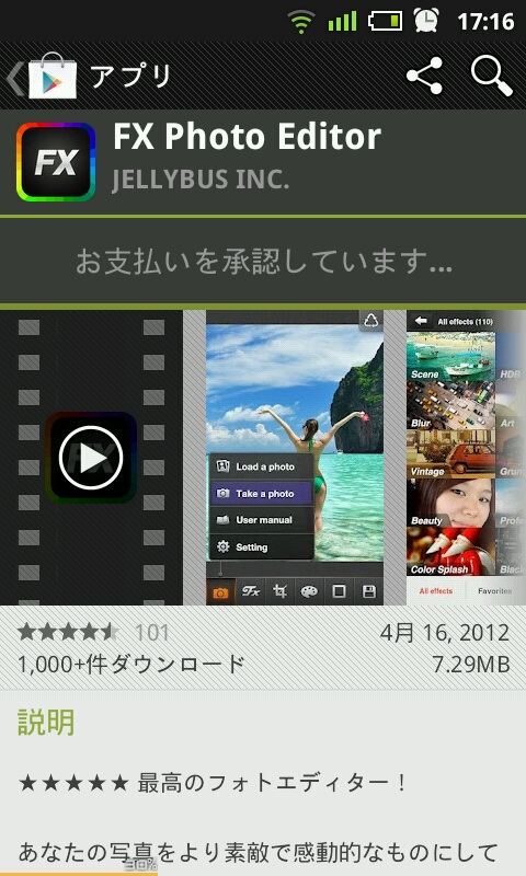 『FX Photo Editor』メーカーは「JELLYBUS」。何となくUIも良い雰囲気だし、メニューが全て日本語になってるし、と感心していたら、iPhone用アプリの『qbro』の会社なのですね! 納得。