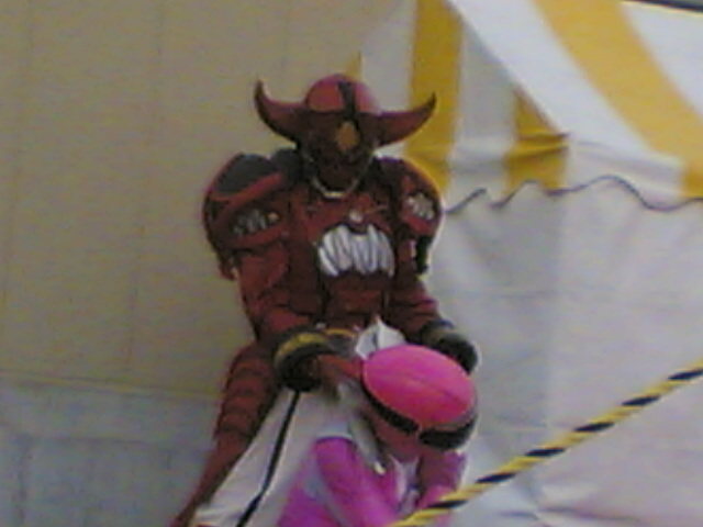 画像右の赤い悪者、造形が細かく、ちょっとお子様には怖すぎるかと思われる着ぐるみです。最近の悪者は進化していますね。それに比べて、ヒーローは昔ながらのスタイル、、、寒そう(笑)。