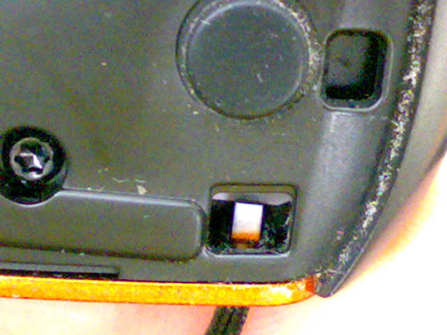 バッテリカバーを外すと、右下に白くいかにも“外せます”といったプラスチック(ゴム?)が入っています。