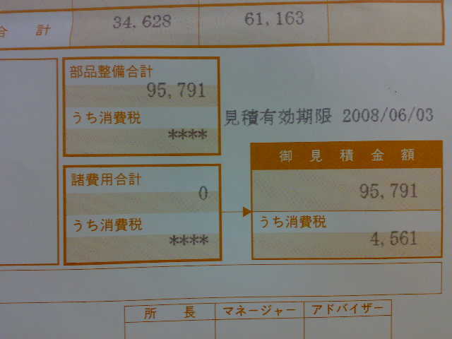 塗装済みのバンパーが品切れ(?)だったとかで、無塗装のバンパーに塗装代もかかっているので、かなりイイお値段(9万超)の見積もり、、、もし自腹だったなら、もっと適当な方法で済ませちゃいますよね(笑)。