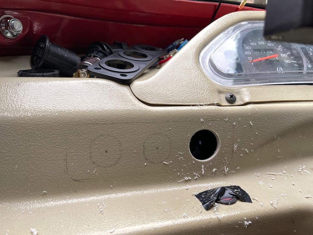 パネルを当てがって、消えるボールペン(笑)で線を引き、たけのこ型ドリルで30mmくらいの穴を開けました。