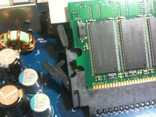 爪で止まっているのかと思っていたら、こんなしっかりとしたレバーが両側にあります。それをグイっと広げると、メモリも一緒にグイっと持ち上がります。そう、ファミコンカセットをイジェクトする時のような感覚です(笑)。