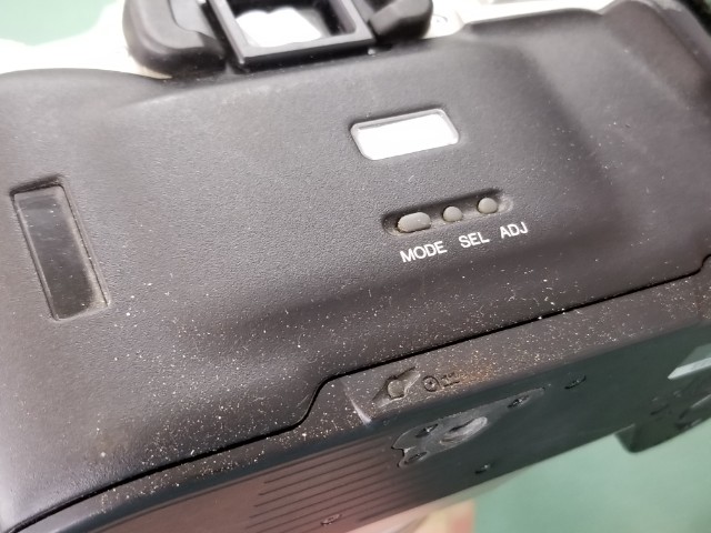 なんか、液体の飛沫か何かが付着したような痕跡があります。ファインダーにも同様の汚れがあるので、雨とか海とか川とか、うどんとかでしょうか?